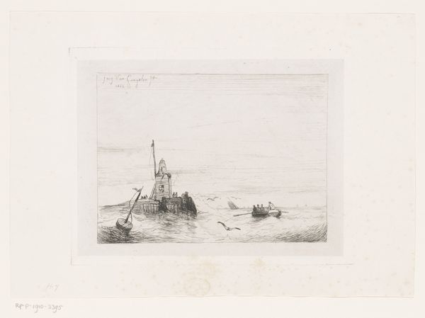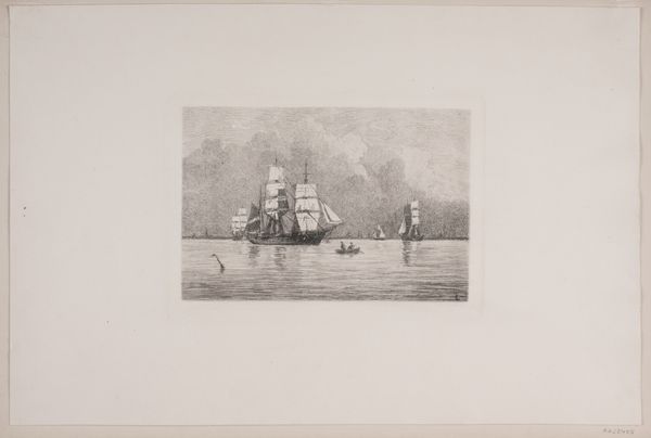 Carl Locher created this etching, titled "Ships in the Sound," sometime between the late 19th and early 20th centuries. It depicts sailing ships navigating the Øresund, the body of water between Denmark and Sweden. Locher’s detailed rendering speaks to the importance of maritime activity for Denmark, a nation historically reliant on naval power and trade. The image itself is interesting; it's not a painting, but a print. This would have made it more accessible to the general public. We also notice the artist's signature. This suggests that artists were beginning to understand the importance of self-promotion and recognition. Understanding this artwork requires researching Denmark’s maritime history, the economics of naval trade in the region, and how artists sought to represent this important aspect of Danish society and culture.