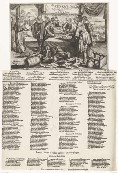 Curator: This print, a satirical piece from 1674 titled "Spotprent op de bisschop van Munster," depicts the Bishop of Munster in quite an unflattering light. It’s an engraving and resides in the Rijksmuseum collection. What are your first thoughts? Editor: It's definitely busy! A swirling mass of figures. The Bishop looks rather uncomfortable, trapped in that tub. It feels very theatrical, but also grotesque. What do you see happening here, symbolically? Curator: The symbols are rich! Notice the Bishop in what appears to be a barrel – a form of public shaming and containment. Consider the animals present. The dog often signifies loyalty, now twisted to mock faithfulness, juxtaposed with the cat symbolizing cunning. Even the gestures are coded; pointing fingers or raised fists can communicate scorn and moral judgement. What emotional cues do you think would have registered with the 17th century viewer? Editor: It makes me think about how universal mockery is, but also how specific the symbols must have felt at the time. The average person knew exactly who each figure represented. Curator: Exactly. It taps into a cultural memory of religious and political conflict, filtered through humor. A modern audience, however, might need assistance to decode this fully. Editor: The engraving feels dense with meaning that goes far beyond just making fun of someone. Curator: Absolutely. Consider the image as a snapshot of public opinion, an early form of mass media leveraging shared cultural references. What lasting impact do you think satirical prints such as this had on contemporary audiences? Editor: Understanding the historical language of these images definitely deepens my appreciation. It shows that visual satire is very embedded in cultural conflict. Curator: Indeed, and helps to underscore how artistic representations function as vital instruments to interpret complex social and political dramas across centuries.