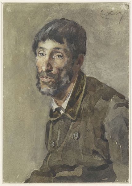 Curator: The museum is delighted to present Léo Gausson’s “Autoportrait” from 1889, rendered in oil on canvas. Editor: My first impression is the intimacy of the gaze, and how earthy the colors are – a very personal depiction it seems. I find the browns and reds both warming and quite melancholic. Curator: Absolutely. Let's delve into the structure; Gausson masterfully employs a limited color palette, adhering closely to shades of brown, red, and ochre. Semiotically, the beret atop his head hints at bohemian leanings or a desire for artistic identification, almost a proclamation. Editor: Yes, but let’s also consider the artist’s touch. The materiality is crucial here: look at the texture. Notice the visible brushstrokes, how they give form and substance, building up layers, one upon another. It gives a rough-hewn quality, which feels so much less like the product of "high art" and more closely akin to laboring craft. Curator: Indeed. And the composition is carefully considered; he’s positioned slightly off-center. That asymmetrical arrangement lends a dynamism to the work that would be absent if it was a typical portrait. Editor: The thick impasto brings a tangible presence to Gausson, drawing attention to the handmade quality of the art object. We shouldn't disregard the socio-economic elements at work. Who had the resources and leisure to commission or create such a work? What was the artistic scene like at the time? All this shapes not just the painting but its meaning too. Curator: Precisely. Examining these visual cues allows us to read Gausson’s statement of self within the conventions and innovations of late 19th-century portraiture. His choice to portray himself with such directness indicates a clear artistic statement. Editor: Exploring art through its materiality provides crucial socio-cultural understanding, linking art, labor, and identity within historical production networks. That perspective shifts our interpretation toward the economic factors in how art has evolved to today. Curator: Well, for me, unpacking how visual components shape meaning makes viewing art quite special and insightful. Editor: And, I believe understanding its origins in the making adds richness and a practical view to those readings, enhancing one's personal insight into how and why we regard and appreciate a work of art.