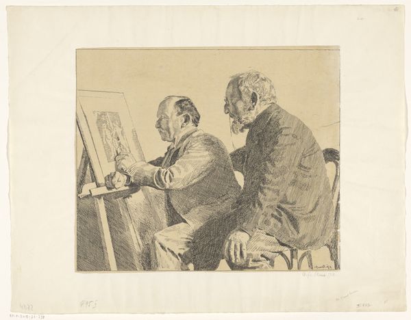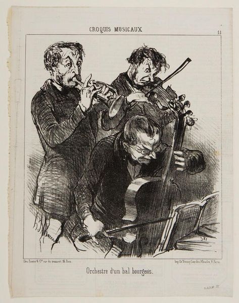 Curator: Oh, this is killing me, it's just killing me! They all look utterly miserable, as though they are being tortured by the symphony. Editor: What a fascinating observation! This lithograph by Honoré Daumier, dating back to 1852, is titled "Three Amateur Musicians Before a Concert." The piece, housed in the Rijksmuseum, offers a sharp, critical look at bourgeois culture. Curator: Critical, yes, definitely critical! But it’s also so funny and sad at the same time. You can almost hear the scraping, screeching sound of instruments being warmed up badly. One almost hopes they decide to can it and just head to the pub. Editor: This work exemplifies Daumier’s talent for caricature, wouldn’t you say? Beyond the humor, the drawing critiques the pressures of class and societal expectations around artistic performance and the supposed benefits of high culture. The expectation of these men to perform transcends the simple fact that their faces betray some serious pain. Curator: He makes it clear how forced these displays of culture are. All the affectation is there in the puffed chests and upturned faces of those hoping to strike an artist's pose! I get a definite whiff of Romanticism, albeit satirized through a critical lens. It’s beautifully done. Look at the cross-hatching and detail! Editor: Precisely! There's an implicit argument, I think, about authenticity and access to cultural capital here, with its ties to gender. Are women absent here because their musical performances would be deemed 'more palatable,' or is there more to it than meets the eye? Curator: Very perceptive. Yes, their masculinity seems almost desperately performative, like they need to be visibly suffering to show how serious they are. Editor: In essence, Daumier is holding up a mirror to society, challenging us to consider who benefits from these rituals, and who might be left out or even harmed by them. Curator: Exactly. I feel I've been at that concert and will have nightmares tonight because of it! Thanks, Daumier. Always keeping it real, even when it hurts... or screeches. Editor: Absolutely. His caricatures resonate beyond his time and provide insight into ongoing discussions about access, cultural institutions, and the individual in society.