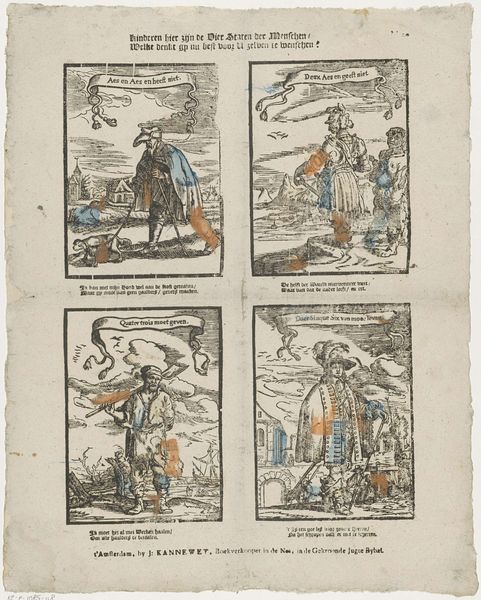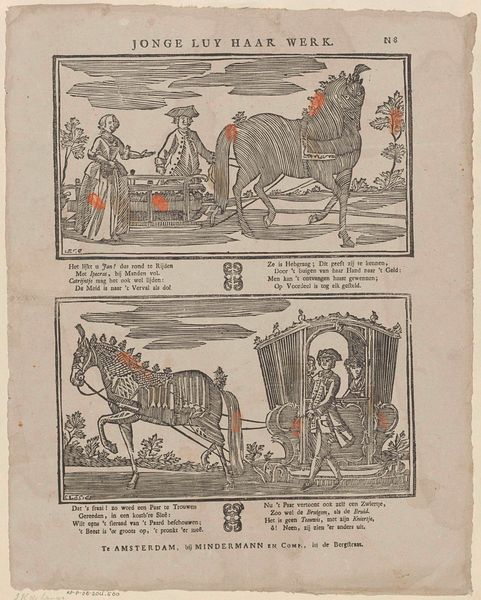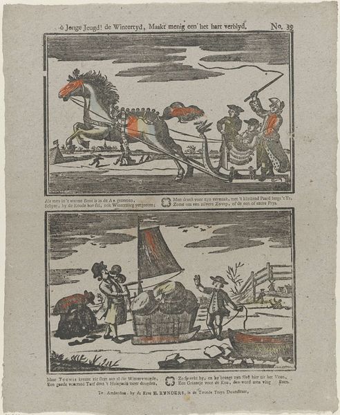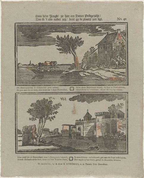 Editor: This engraving by Johannes Donker, titled "Two Images of the Flood in 1809," presents a striking contrast. The upper scene depicts a stormy landscape, and the lower, the interior of a flooded home. I’m immediately struck by how different the visual strategies are for depicting public and private spaces of disaster. What was the public role of images like this during that time? Curator: These prints served several critical public functions in early 19th-century Netherlands. The stark contrast you noticed isn’t accidental. The landscape view emphasizes the scale of the disaster, highlighting the vulnerability of the land and the collective experience. The interior scene brings it down to a personal level: what the loss meant to individual families. Consider who the intended audience was. Editor: It seems designed for a broad audience, perhaps to elicit empathy and support. How would this kind of imagery circulate in society at the time? Curator: Exactly. Prints like these were often sold as news items, as visual reports of significant events. Remember, this predates photography; print was a primary means of disseminating information. They were frequently displayed in public spaces or collected as records. They reinforce existing ideas and expectations of societal hierarchy through gendered representation, namely how the 'Man vlecht saadloos ub her bed'. But who has access to that public? And who gets to make their stories told? Editor: It’s fascinating how such a seemingly simple image reveals such complex socio-political dynamics. Seeing them together adds so much to what each picture means individually. Curator: Precisely. It pushes us to think about how art mediates our understanding of disasters and its ability to mobilize communities through public engagement and visual representation of political issues. The impact of social institutions that determine visibility should be a topic to further consider.