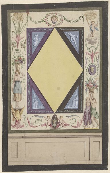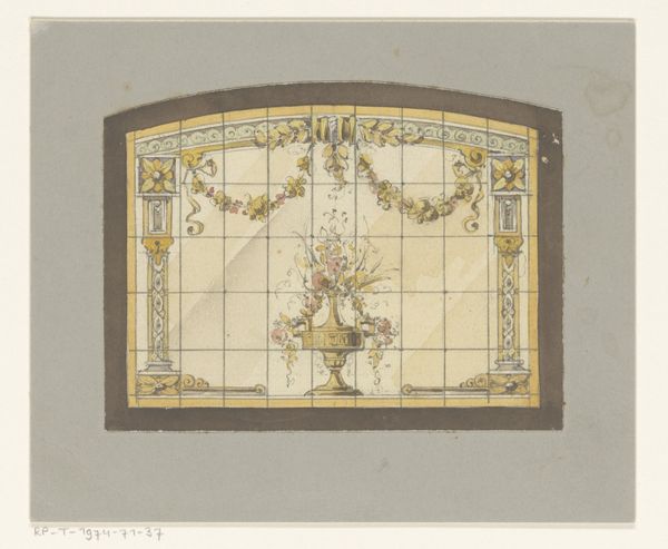 Editor: So, this is "Ontwerp voor een glas in loodraam met twee vogels"—a design for a stained-glass window with two birds, made after 1907. It's an ink and drawing on paper, unsigned. I am curious about this decorative-arts piece with the repeating structure and symmetrical elements. What strikes you about it? Curator: I see a fascinating collision of craft, industrial production, and consumption happening here. Glasswork, even in the Art Nouveau style which softens the blow, still required the industrialization of glass production. Look at the regimented grid versus the hand-drawn elements. How were these images produced? Is there a social hierarchy reflected here, with the bird motifs signaling bourgeois sensibilities imposed on an industrialized process? Editor: The "regimented grid" you mentioned is intriguing. How would an artist working within Art Nouveau reconcile such mass-producible forms with their artistic expression? Curator: Consider the materials. The 'preciousness' lies not only in the design but in the glass itself. Art Nouveau commodified ‘art,’ moving it beyond elite patronage. Even in preparatory drawings like these, the tension between artistic agency and the coming mechanics is evident. How might the laborers producing such glass regard the romantic imagery being imposed upon their work? Editor: It is interesting to think about this preparatory design with industrial-scale labor and production methods already implicit in it! It makes the artwork much more than just decorative. Curator: Precisely! By examining these pieces, we can unpack not only an aesthetic movement, but the material realities that shaped it and which it, in turn, sought to shape. Thanks for highlighting it, its making becomes its story.