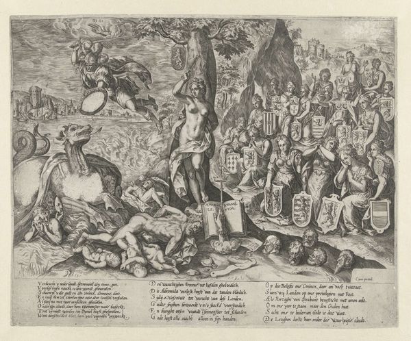 Curator: Welcome! Before us is the etching and engraving “Est-ce un enchantment...” by Claude Gillot, dating sometime between 1685 and 1722. It depicts what seems to be a rather fantastical scene. Editor: That’s one way to put it! My first impression is sheer bewilderment. There's so much happening! The line work is incredibly intricate, giving a dense and chaotic feel, a bit like an alchemical drawing. Curator: Indeed. Considering Gillot’s connections to the theatre, and his interest in Commedia dell'arte, we can view this chaotic scene as a kind of theatrical representation of superstition. The performance of dark rituals has, in the right socio-political circumstances, long held an influence in the European imagination, and artworks like this only work to confirm that fascination. Editor: I am struck by the materiality. The use of etching and engraving to create such fine lines allows for a level of detail that evokes the bizarre imagery associated with witchcraft and folklore, a sort of commentary on the artistic labor that goes into crafting belief. Look at how the various elements - the monsters, the tortured figure, the tools - all rendered with meticulous detail – it's a true feast for the eye! Curator: And don't forget the written element—lines of poetry, framing the scene. That’s an interesting material fact in itself: the literary, textual construction combined with the image-making both reinforced certain social realities while opening doors to imagined or spiritual realms. Editor: Yes, that text provides a context and serves to normalize it for consumption by a contemporary audience—or perhaps offer a subtle critique. It’s interesting to consider how prints like this circulated, were they mere curiosities for the wealthy, or did they influence popular perceptions of those deemed heretical? Curator: Exactly! The politics of imagery here are clear: associating witchcraft with the spectacle, with theatre, and with the monstrous works as a very clear ideological messaging technique. The museum frames and gives that messaging a new life, a continued resonance within contemporary debates. Editor: Absolutely, it allows us to ask what kind of labor went into creating this representation? And to whose benefit? Looking closely makes me aware of my own contemporary biases about consumption and display, while inviting a renewed respect for Gillot's craftsmanship. Curator: Reflecting on this piece, it is impossible not to notice its potent influence on later artists engaged with social commentary through satirical printmaking. Editor: I’m struck most of all by how close looking draws us into this work, exposing layers of context and challenging simple readings, all thanks to an enduring combination of ink, metal, and imagination.