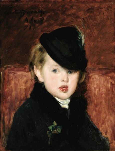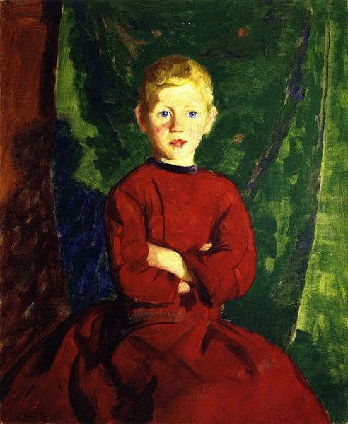 Curator: Standing before us, we have Robert Henri's "Irish Boy," painted in 1898, a striking oil painting that's both tender and unflinching. Editor: The immediate mood that hits me is thoughtfulness. There's a certain melancholy to his gaze. The brushstrokes feel… immediate. Like a quick study capturing a fleeting feeling. Curator: Exactly. Henri was part of the Ashcan School, a group known for depicting everyday life with realism. Here, he presents us with a working-class boy, painted not with idealized beauty, but genuine humanity. Look at his clothing and those rosy cheeks. Editor: That slightly oversized coat gives him such a great vulnerable quality. The almost clumsy way he's clasping his hands, like he’s trying to comfort himself, or hold on to something precious. Did Henri paint him outside or somewhere like the bar? It all seems very unkempt and cold to me. Curator: Art historians will connect these artworks and realism styles to increasing urbanism, populism, and democratic ideals, because such depictions of poor populations had begun to surface frequently in popular literature. These new migrants that began settling in large cities were being scrutinized not only for how well they integrated, but also how society's view on class consciousness was in a state of change. Editor: It makes you think, what was this boy’s life like? He doesn’t feel posed, he’s not play-acting in that moment; there’s a quiet truth radiating from this kid. Did Henri see a little of himself in the Irish Boy, capturing a kind of silent, everyday hardship? Curator: The context, too, matters. This was painted during a period of immense social change. Irish immigrants faced hardships and prejudice. Henri might be subtly drawing attention to these issues. It’s both a portrait and social commentary, isn't it? Editor: Yes! And seeing it now, it feels like Henri found a way to connect with humanity that art always strives for. This portrait is really great work! Curator: The work’s impact reverberates still today as its image has stood as an exemplary symbol of childhood struggles, and it does so with compelling depth!