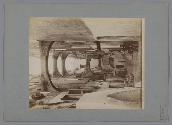 This photograph, ‘Zolder van het Buitengasthuis te Amsterdam,’ of the attic of the former Buitengasthuis in Amsterdam, is presented in sepia tones. The light is dim, illuminating rough wooden beams and supports that converge towards a vanishing point deep within the frame, creating a sense of depth and enclosure. The composition emphasizes the architectural structure, with the converging lines and repetitive forms creating a rhythm that leads the eye through the space. This linear perspective and play of light and shadow serve to destabilize traditional notions of architectural photography, challenging viewers to reconsider their perception of space and form. The sepia tone adds a layer of nostalgia and historical distance, inviting reflection on how architectural spaces embody cultural memory and function as sites of both construction and deconstruction of meaning.