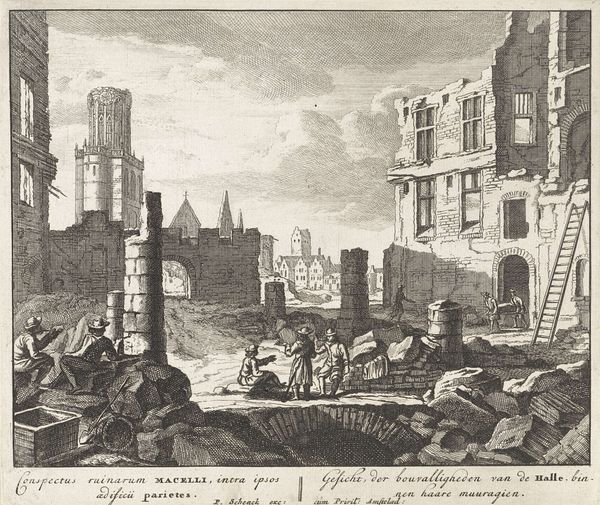 Editor: This print, "Ruins in de Magdalenasteenweg te Brussel, 1695," by Pieter Schenk, feels so stark. It's almost like a historical photograph, documenting the destruction in Brussels. The black and white etching really emphasizes the devastation. How do you interpret this work? Curator: It's a powerful image, isn't it? I see this print not just as a cityscape but as a political statement. Schenk isn't simply recording damage; he's showing us the human cost of conflict. The War of the Grand Alliance had a huge impact. Notice how the destruction isn't presented as heroic or glorious. It’s intimate, street-level. The people amidst the ruins seem lost, almost erased by the magnitude of the event. Consider also that Schenk created this print years after the bombardment. Why revisit this scene of devastation? Editor: Perhaps to remind viewers of the consequences, the fragility of peace? The bombed-out architecture dominating the people is an interesting choice by the artist. It brings attention to their helplessness and lack of security. Curator: Precisely! And in doing so, he implicitly critiques the power structures that led to such destruction. Whose interests were served by this conflict, and at what cost? The very act of representing these ruins speaks volumes, ensuring that the victims are not forgotten. The title calls out this section as leading up to a "hof," what might it suggest to juxtapose an area going toward some nobility or royalty, and a street decimated in the war? Editor: That’s fascinating, I never considered that contrast, of ascent versus destruction. It certainly shifts how I understand Schenk’s message! Curator: Art from this period engaged with many critical and political considerations and it provides the chance for dialogue. I find the social commentary as relevant today as it was back then. Editor: It's really made me think about how art can be both a historical record and a form of protest.