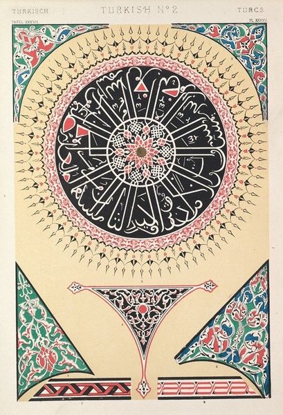 Owen Jones created ‘Turkish no. 2. Painted ornaments from the Mosque of Soliman in Constantinople’, a print that visually arrests with its intricate detail and balanced composition. Dominating the work is a large circular motif, filled with complex geometric patterns and calligraphy in black and white, highlighted with touches of red, against a cream background. This creates a stunning interplay of light and shadow. Jones, known for his studies of historical ornament, seems to use these forms to explore how visual elements can create harmony. The geometric precision and rhythmic repetition speak to both mathematical and aesthetic principles. The circular pattern can be decoded as a structuralist approach, where the form and spatial organisation of the visual elements convey meaning. Note how the details encourage continuous looking and interpretation. The cultural codes embedded in the calligraphy and patterns open avenues for considering the connections between art, culture, and representation. It reminds us that art is a complex site where meaning is continuously negotiated and re-evaluated.