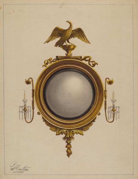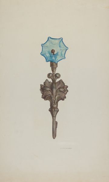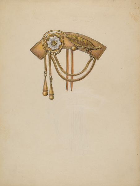 Curator: I'd like to draw your attention to this drawing, simply titled "Brooch," created by Edward White around 1936. It's a watercolor that captures the elegance of Art Deco jewelry design. Editor: It feels almost… otherworldly. The deep purples and golds evoke ancient royalty or a talisman of sorts. I love the stylized starburst in the center. It's captivating. Curator: Indeed, that central motif is quite striking. The brooch’s design, with its concentric circles and geometric embellishments, reminds one of a celestial map or some kind of astronomical instrument, filtered through the sleek, modern lens of the Art Deco era. Editor: Right! Those repeating shapes resonate with a sense of time—almost hypnotic in the attention to detail. Makes me think of how adornment served not just as decoration but as amulets with a greater cultural function, a kind of shield, especially back in that interwar period. Curator: Precisely. Decorative arts of this period very frequently mirrored technological and social advancements, using stylized motifs of speed and industry while still echoing symbols of protection or spirituality. White may have consciously tapped into this broader sensibility, marrying old-world craftsmanship with modern symbolism. Editor: You know, looking closer, it's like there's an implied narrative happening here. That burst of light in the central element and these trailing pendants could be perceived to be visual echoes of stars... It seems almost primed to set the stage for the wearer as they step into the social scene as its protagonist. Curator: A delightful suggestion! Ultimately, whether read as symbolic of astronomical precision, or as aspirational fashion design, or even personal mythology, "Brooch" prompts interesting dialogues between tradition and the future, luxury, and talismanic powers. Editor: It definitely urges us to view everyday objects not just as superficial aesthetics but potential portals for reflection about personal power.