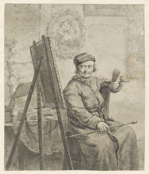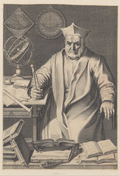 Curator: Oh, this is a beauty, isn't it? What a feast for the eyes. The artwork that's before us is titled, "Portret van Arnold Marcel". Aert Schouman, working in 1748, rendered this intimate scene using pen and dry media on paper. It resides in the Rijksmuseum. What are your first impressions of it? Editor: It feels like stepping back in time. There's such detail in the etching. It looks very…scholarly, if I can put it that way, with all of the instruments. Almost as though it’s more a portrait of the mind than the man, and there are a lot of curios. Curator: Exactly! And isn’t it just brimming with symbols of the Enlightenment? Here you can see Marcel surrounded by the tools of a polymath. Notice the scientific instruments – globes, lenses, measuring devices… He's presented as a figure deeply immersed in the world of learning and discovery. Schouman clearly portrays not just Marcel the man but also Marcel the intellectual. He would have been making reference to a rising merchant class that was more inclined to purchase portraits than their patrons. Editor: Yes, and those spectacles he’s holding. They could be props, but I think they're the key to how we understand how art in that time was more inclusive and about who had enough capital to buy into the cultural zeitgeist. A true celebration of Rococo exuberance but not at the expense of intellect. What do you make of the fact that it's rendered in dry media instead of the traditional oils that you find a lot in painting in the Dutch Golden Age? Curator: Ah, now that is what makes this drawing so intriguing. Dry media on paper, it provides a stark contrast to the elaborate grandeur often seen in oil portraits from the Golden Age. I find it incredibly poignant—it brings the portrayed person down to earth, allowing for a more approachable quality of human connection with its subject. It shows we can value the human for what they have accomplished in life more than their riches, for one thing. The material makes it more than a typical historical document, for sure! Editor: Precisely! Looking at this "Portret van Arnold Marcel", I can almost feel Schouman’s touch on paper. It also illustrates how patronage in Holland and generally in Europe allowed for diversity in painting. Not just genre-wise but also when it comes to representing middle-class patrons. Curator: It certainly highlights how the power and wealth from maritime power shaped people's tastes, then, and informs how art is shaped now. It is a beautiful record of human intellect.