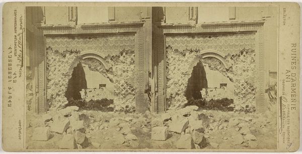 Curator: This stereograph, taken sometime between 1862 and 1876 by Jean Andrieu, offers a "View of the Ruins of the Temple of Diana in Syracuse". It's a gelatin silver print, typical of photographic processes that helped democratize image-making during that era. What strikes you first about this image? Editor: Dust and stone, immediately. I'm getting this very potent feeling of being among shattered monuments—of beauty, yes, but beauty draped in somber reflection, as the old stones tell their sad, sad stories in whispers through the wind. Curator: Yes, there’s a strong sense of melancholy, a reflection on the ephemeral nature of civilizations. Syracuse, after all, was once a major power in the ancient world. Andrieu's choice to use the gelatin silver process would have allowed for relatively quick development and replication, contributing to the wider dissemination of such views and influencing understandings of classical sites. Editor: The stark contrast really stands out, it captures both destruction and survival simultaneously, juxtaposing the tumbled columns against the relatively untouched architecture behind it—it seems that even in ruins there's something eternal. This reminds me, that ruins are, also, an important raw resource in their time, for a new, often humble and poor construction that will in turn become a vestige itself for another one after. Curator: Absolutely. We see the way photography served as a tool not just for documentation, but also for constructing narratives about the past. The material conditions of photographic production, its relative accessibility, allowed Andrieu to frame these classical sites within the burgeoning tourism industry of the time. It highlights the consumption of the "ancient". Editor: Well, from my perspective, art has always offered this quiet rebellion against time's relentless march. It's not just the ruined temple itself that is the art piece, but the fact that someone, here Andrieu, cared enough to frame its melancholy. This picture reminds us that beauty isn't just about being pristine. Sometimes it is better, sometimes, beauty blossoms right out of decay, if it doesn't it certainly lingers at least. Curator: Precisely. Thank you for sharing your impressions, I believe your insight adds depth to our appreciation of both the photographic technique and the cultural significance embedded in this particular view of Syracuse's ruins.
