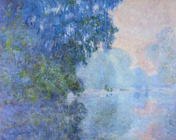 Claude Monet captured this scene, Morning on the Seine, near Giverny, with oil on canvas. The dominant visual experience is one of tranquil diffusion; soft pink hues and muted blues are interwoven, creating a hazy atmosphere. The water’s surface acts as a mirror, reflecting the sky and foliage in broad, broken brushstrokes. Monet's approach here moves beyond mere representation. We can understand it as an investigation into the transient effects of light and atmosphere. The composition is structured around a play of reflections, challenging the viewer's perception of depth and space. The painting destabilizes traditional notions of landscape, prioritizing sensory experience over clear, defined forms. Note how Monet uses color and texture to evoke a feeling of fleeting time, capturing a momentary atmospheric condition. This focus on the ephemeral speaks to a larger philosophical interest in the nature of perception and the instability of reality itself.