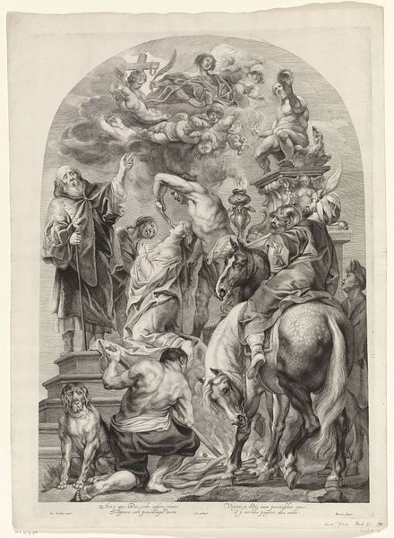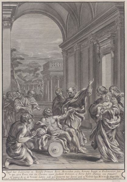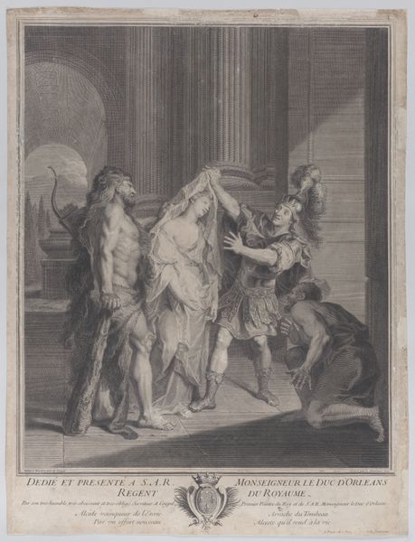 Editor: Here we have Marcus Tuscher’s engraving, "Forarbejde til maleriet: Danmark og Norge hylder Chr. VI," created between 1746 and 1749. It seems to depict a regal figure on horseback, being presented with crowns and floral wreaths. The details are fascinating but also quite dense. What are your initial thoughts when you see this image? Curator: This piece resonates deeply within the framework of power and representation. Think about it – Tuscher created this as preparatory work, a stage in visualizing the relationship between Denmark, Norway, and their ruler, Christian VI. How does the artist negotiate the tensions between celebration and the realities of colonial power dynamics? Notice how the figures presenting the wreaths are positioned, almost subserviently. How does this visual hierarchy reflect the social and political power structures of the time? Editor: So you're saying this isn't simply a celebratory image, but also a commentary on power? The body language of the presenting figures did strike me as somewhat subdued, despite the offering of such celebratory tokens. Curator: Precisely. We must ask, who is being celebrated, and at whose expense? Consider the historical context. Absolutism was the driving force in Denmark, enforcing its political goals. In this context, it is very important to recognize the function of visuality as a means for maintaining hegemony. Look at the grandeur of the architecture, it’s not just ornamentation. Do you see the statue of the woman standing guard as another sign of cultural hegemony? Editor: That is something I completely missed initially. Seeing how you put this work in a sociopolitical framework casts the image in a new light. It almost feels like propaganda. Curator: It certainly shares common ground with propagandist messaging. Analyzing art means engaging with its inherent power dynamics and challenging what it seeks to normalize or naturalize within its specific historical framework. Editor: I’ll definitely carry that perspective as I continue to examine this piece and other works from that era. Thanks for sharing your insight. Curator: My pleasure. Remember, critical art history requires that we investigate beyond face value and continually question the social, political, and economic implications embedded within the visual.