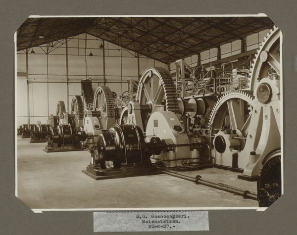 Curator: This photograph, titled "S.O. Goenoengsari. Molenhuis & Motoren. 1 Juni 1927.," captures the interior of what appears to be a machine house. Its industrial subject matter marks it clearly in the photographic output of 1927. Editor: Wow, what a powerhouse of gears! My first thought is: this space hummed, probably roared. Look at the scale, the repetition, those enormous wheels—it almost has a pulse, doesn't it? You can imagine the smell of oil and maybe the faint echo of the engineers and workers bustling about. Curator: Absolutely. It’s a striking depiction of industrial power and the visual language really echoes precisionism, but its realism grounds the image in its immediate socio-economic context. Given its title and implied Indonesian origins, we must consider the photograph in light of Dutch colonial activity and resource extraction in the period. Editor: Right, the date becomes important then, doesn't it? June 1st, 1927—what stories could this machine house tell if it could whisper of its time and function? Thinking of what the relentless engine could do back then. What did these machine churn out for people in far distance lands? The photography also highlights such geometrical rigor in how machines were assembled. Curator: The photographic technique here isn’t simply documentary, the play of light and shadow almost fetishizes the machinery, underscoring a colonial perspective on progress and modernization as inherently desirable, a sort of mechanized manifest destiny that erases any considerations for the people affected. Editor: That gives me pause. I originally saw almost beauty in those metallic teeth of gears. Now it's almost oppressive because of how huge everything is and how little natural light you see. Perhaps a better analogy might be if gears replaced the nature. You might consider if human presence makes the artwork even bleaker, or would you say that by showing them you somehow offer it meaning? Curator: Well, given the photographic realism, it seems the photographer focused on rendering an objective truth of the factory which then turns those machines into objective power centers as such a place as this serves or profits a colonizing center far away. Editor: That's powerful to keep in mind; these motors drove not only production, but a much larger world system of exploitation as well. Curator: Indeed, I'm glad we've managed to extract so many layers of meaning, shifting our gaze away from a surface appraisal to a broader structural analysis. Editor: Precisely, from silent gears to shouting volumes about society, progress, and the stories objects unknowingly embody.
