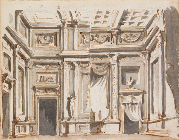 Editor: Here we have "Ionic Entrance Hall," made sometime between 1800 and 1900 by an anonymous artist. It’s a pencil drawing that depicts an interior space with a series of columns. I find the repetition of the columns quite striking and, dare I say, a bit intimidating. What’s your read of this artwork? Curator: The interest resides in the calculated deployment of form. Observe the insistent linearity, the rigid geometry of the floor tiles and ceiling panels mirrored in the steadfast verticals of the columns. This rigorous structuring evokes, of course, classical ideals of order and rationality. Note the contrast provided by the figures, which, while diminutive, add a vital human element. Do you discern how their positioning guides the eye and emphasizes the sheer scale of the architectural space? Editor: I see what you mean about the contrast. It feels almost like a stage. The people look more like set dressing than the focal point. It is so precise it looks like a stage, yet with very simple tools! What are your thoughts? Curator: Indeed. It exemplifies the Neoclassical embrace of idealized forms. It isn't about capturing reality; it’s about distilling it to its most fundamental, geometrically sound components. It reminds us of an unwavering dedication to aesthetic ideals. Editor: It's amazing to see how the simple medium of pencil on paper can create such an impactful sense of grandeur and geometric harmony! Curator: Indeed, the essence of the piece resides not in the overt subject matter, but rather in the compositional language used to express it.
