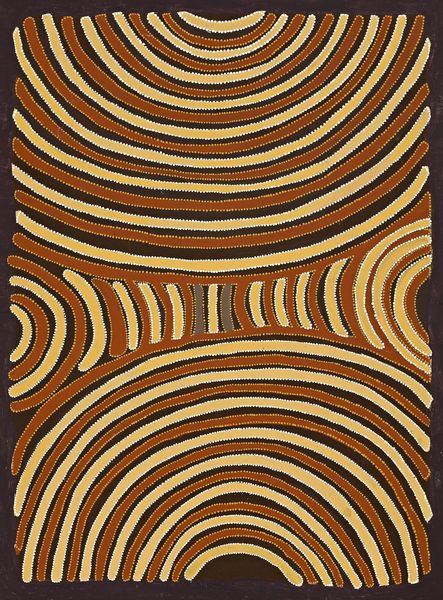 Abie Loy Kemarre created Painting 99F016 with a seemingly endless arrangement of circular forms. These shapes give the painting a unique visual rhythm. The copper lines, with their dotted perimeters, lie over a stark black backdrop, creating a textural contrast. The structure might seem purely abstract, yet it pulsates with meaning. These compositions, far from being random, often reflect the artist's cultural background. The structure invites us to consider the artwork through the lens of semiotics. Each copper-colored arc can be seen as a sign, hinting at deeper narratives that explore themes of connection, growth, and the cyclical nature of existence. The overall effect is more than decorative. It provokes an intellectual curiosity about the interplay between form and cultural meaning. Art's essence isn't static; it's an evolving dialogue between the artwork and the viewer.