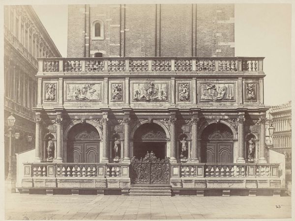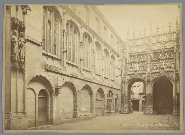 Editor: Here we have Mèdèric Mieusement's "Zuilengang in het kasteel van Blois," a photograph, more specifically an albumen print, created sometime between 1880 and 1900. The colonnade and stonework feel incredibly solid, like a testament to the labor and resources poured into this architecture. What stands out to you? Curator: It's a compelling view, particularly when we consider the labor invested not just in the Chateau de Blois, but also in the very act of capturing this image. Albumen prints like this required a complex production chain: glass plates, darkroom chemicals, the albumen itself, usually derived from eggs, all material inputs subjected to skilled labour. Editor: Eggs? I had no idea! So, every print represents a sort of agricultural-industrial convergence? Curator: Precisely. And notice the photographer's focus. Mieusement isn't highlighting aristocratic life, but the physical space – the means of displaying power. The photograph transforms stone and mortar into commodities, both documenting the built environment and participating in its commodification through the art market. Think about the layers of craft and technology involved, each step influencing the final product. Editor: It’s fascinating to consider the image not just as a representation but as an artifact of labor itself. Was there a mass consumption of this type of photographs back then? Curator: Certainly, photographs of architectural landmarks became increasingly popular with the rise of tourism and the burgeoning middle class eager to consume images of 'high culture'. These prints democratized access while also solidifying social hierarchies through the selective portrayal of specific places and lifestyles. It invites a conversation around production, consumption, and the social implications of making art available to different audiences. Editor: So, it’s about looking beyond the beautiful facade and understanding the economic and social factors that shaped its creation and circulation. I never would have thought of eggs when I first looked at it! Thank you for your time. Curator: My pleasure. Examining art through the lens of materiality allows us to see its intricate connections to broader historical forces.