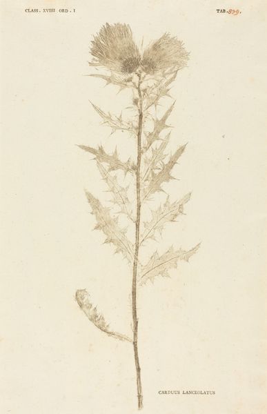 Editor: This is "Carduus Marianus," possibly etched sometime between 1757 and 1764 by Johann Hieronymus Kniphof. It's a print, depicting what looks like a milk thistle. The detail achieved through etching is really striking; it feels incredibly precise. What stands out to you? Curator: Precision, yes, but let’s think about why that precision was so prized. Look at the process of etching. It requires a mastery of technique, but also speaks to the rise of scientific illustration. These weren't simply decorative objects; they were tied to botanical studies and the dissemination of knowledge. Who would have consumed these images, and why? Editor: I hadn't thought about it like that. I guess botanists, maybe? Or wealthy collectors interested in science? What does that say about the social context? Curator: Exactly. It's about access to knowledge, about power structures, and the labor involved. This wasn't mass-produced like a woodcut of the time might be, thus this meticulous technique reinforces exclusivity. Think about the materials used: the metal plate, the acids, the paper, the ink – all commodities embedded in trade networks. Where would the artists of the time acquire these? Editor: So, it's less about the beauty of the plant itself, and more about how the print reveals systems of production and social status. Curator: Precisely. And the fact that it is categorized in the area of 'history-painting' points to the importance and almost elevated status given to botanical illustration. Can we even describe such work as an artistic genre, when its objective seems so clearly utilitarian? Editor: It's fascinating to consider the artwork in this light – it changes everything! I always looked at art for the art, but focusing on its creation and the world surrounding its making really highlights its value. Curator: Exactly, recognizing those forces in artwork from that time period brings a whole new meaning and significance.