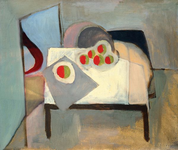 Editor: Here we have Kmetty János’ "Still Life with Jug," an oil painting created in 1927. I find its slightly skewed perspective rather intriguing and charming. How do you read this work? Curator: It's interesting that you see charm in the perspective. To me, this piece exemplifies the era's desire to challenge academic artistic traditions and societal expectations surrounding representation. How do the skewed angles affect the spatial relationships and the implied roles of the objects? Editor: I suppose they make the scene feel less formal, more like a personal glimpse into the artist’s space. Are you saying it challenges established views by rejecting perfection? Curator: Exactly. Think about what's absent: the trappings of wealth, overt political symbolism, a romanticized version of everyday life. The "imperfect" angle emphasizes intimacy. Editor: So, its value comes from depicting the mundane, which gives us insight into the time? Curator: In part, yes. The emphasis on ordinary domestic items - the jug, the fruit - moves away from grand narratives. Also, how do the painterly brushstrokes impact our understanding of Kmetty's intentions, and how might they influence or have been influenced by artistic circles and public tastes? Editor: I see. They seem to add a tactile, lived-in quality to the scene. Like we're seeing something truly immediate. Curator: Precisely. This immediate feeling reflects Modernism’s turn to subjective experience. Consider how these objects are positioned, elevating the intimacy and mundane beauty over grandeur. Editor: So, this seemingly simple still life contains layers of social and artistic meaning related to challenging tradition. Curator: Precisely. We must appreciate what Kmetty's image signifies culturally about both challenging what's traditionally appreciated and celebrating everyday items. Editor: It definitely shifted my perspective, it has a depth I initially overlooked. Thank you! Curator: And you've helped highlight how perspective can change our understanding of both the art and its cultural place, an excellent observation.