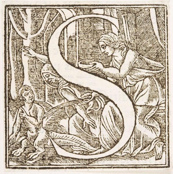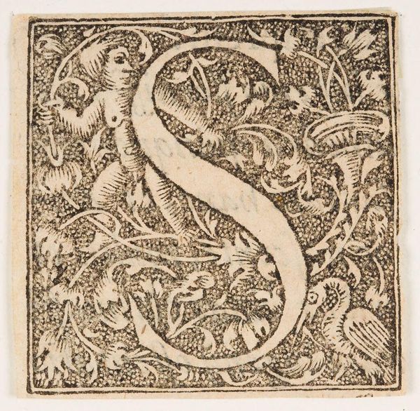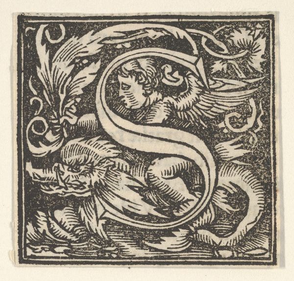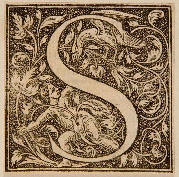 Curator: This small print, titled "Letter S," is an example of early typography, author anonymous. It's part of the Harvard Art Museums collection. Editor: Immediately, I'm struck by the contrast. The crisp letterform against the busy, almost frantic background. It feels quite dynamic, doesn't it? Curator: The materiality speaks volumes. This was likely produced via woodcut, a relatively accessible printing method. It highlights the democratization of image-making. Editor: And how these individual letterforms circulated! This "S" could have adorned anything from religious texts to personal correspondence, each context shifting its meaning. Curator: Exactly. The cherubic figures entwined within the foliage also imply a connection to classical learning. Editor: Thinking about the socio-political context, it’s interesting to ponder who would have had access to such a print and the knowledge it signified. Curator: Indeed, the choice of materials and production methods certainly influenced its reach and audience. Editor: It really underscores how even seemingly simple designs carry profound historical and social weight. Curator: Agreed, a tiny piece, yet a testament to the power of accessible art production. Editor: This letter reveals how the function of images is often inseparable from their cultural moment.