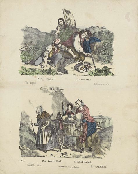 This lithograph titled "Een avond op het land" presents a series of vignettes that capture scenes from rural life. Each scene, bordered in its own little world, uses colour and form to tell its story. Consider the composition: the layout organizes the narratives, creating a visual rhythm as the eye moves from one domestic moment to the next. The colour palette is muted, dominated by earthy greens, browns, and greys, perhaps to emphasise the simplicity and ordinariness of the agrarian setting. De Ruyter & Meijer’s choice of scenes is particularly striking; a man chopping wood and a family at a water trough. These choices create a semiotic field, where each sign – the axe, the animals, the clothing – points to a larger discourse on the role of labour, nature, and community. The interplay of these visual and thematic elements reflects a structuralist approach to art, where meaning is derived from the relationships between different parts of the artwork and how they function within a broader cultural framework.