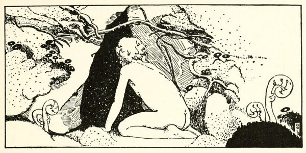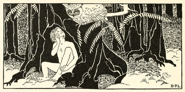 Editor: Here we have "A Little Boy Lost," a 1920 ink drawing by Dorothy Lathrop. It gives me a dreamy, fairytale feeling, like a scene pulled straight from a children's book. There's this stillness to it, almost melancholic. What do you see in this piece? Curator: That melancholic stillness, yes, it resonates! I’m struck by the use of line, aren’t you? It's so incredibly detailed, creating texture and depth without relying on color. Lathrop captures a sense of wonder, yet that “lost” feeling tinges it. I sense childhood vulnerability contrasted against the seemingly safe, almost protective presence of the doe. Makes you wonder, doesn't it, about the lost boy's relationship to the forest? Is it a sanctuary, or another form of being lost? Editor: It's interesting you point that out. I hadn't considered the forest as another form of being lost. The deer seemed more like a guide in my mind. Curator: A guide perhaps, but what kind? The details, look – the intricate pattern on the blanket versus the wild, unkempt forest... it's like two worlds colliding. Maybe the lost boy isn't physically lost, but struggling with that transition from childhood innocence to a more complicated understanding. I wonder what is he looking at? Editor: The hand gesture does evoke a question; a beckoning or reaching... The pen and ink gives this magical world an almost documentary realness that makes me think. Curator: Precisely! A world both grounded and fantastical, which Lathrop portrays so powerfully. And I’m intrigued now with your comment; yes – perhaps the lost boy beckons us into it too… What an extraordinary skill for Dorothy Lathrop! Editor: Absolutely. This piece definitely offers more layers than I initially perceived. Thanks! Curator: My pleasure.