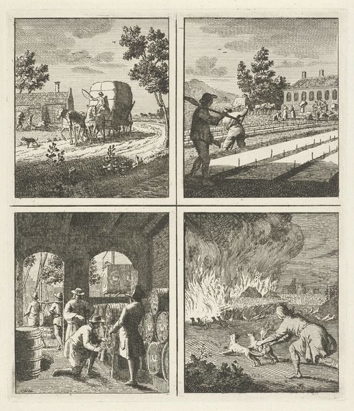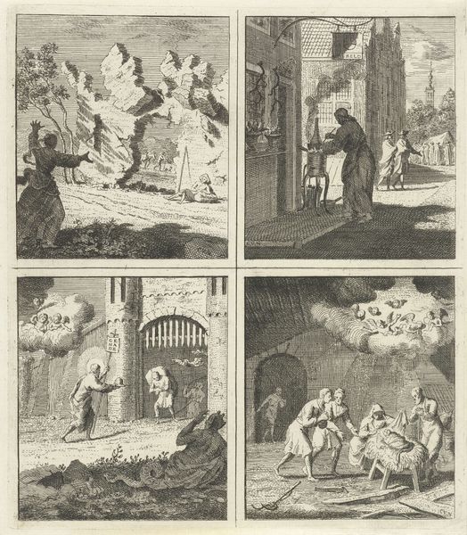 This engraving by Cornelis van Noorde, made in the eighteenth century, presents four scenes within a grid, each a study in moral contrasts rendered through precise line work. The dense hatching and cross-hatching create a tonal range that defines the forms and spaces of these allegorical narratives. Van Noorde employs the grid not merely as a structuring device but as a means of juxtaposing opposing virtues and vices. Each scene's composition guides the eye to discern the moral lesson, contrasting, for example, divine wisdom with earthly self-interest. This formal arrangement suggests a structuralist approach, where meaning arises from the relationships between the parts. Moreover, the work engages with semiotic codes prevalent in its time. The figures, objects, and settings act as signs, conveying ethical messages about penitence and justice. In its totality, the grid presents a framework for understanding societal values, inviting viewers to interpret and apply these lessons. The power of the work resides not only in its aesthetic qualities but also in its capacity to provoke moral reflection.