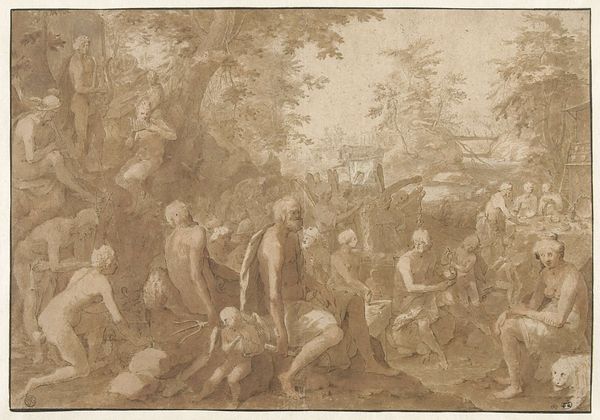 Editor: Here we have Johann Viktor Platzer’s, "The Triumph of Bacchus" from around 1625, currently residing in the Städel Museum. It looks to be watercolor, chalk, and graphite on paper. It all seems a little hazy, dreamlike. So much going on! What exactly am I looking at here? What do you see in this piece? Curator: A glorious, slightly tipsy parade! And that haziness you mention? It feels like a memory, or a half-remembered myth. It speaks to me of a world viewed through a wine-soaked lens. Imagine the scent of crushed grapes, the echoing laughter... Does it bring anything to mind for you? Perhaps a modern-day bacchanal? Editor: Sort of like a college party gone wild, but with elephants and a temple in the background. But why paint it this way? Curator: I think it's the essence of the Baroque aesthetic. A yearning for a bygone Golden Age, where the gods walked among us. Plus, let’s consider the medium - chalk, graphite, watercolour. They all lend to a more illustrative than a grandiose and traditionally Baroque effect, don't they? Editor: That makes sense, illustrative almost like it was plucked from an old manuscript. Curator: Precisely! It invites us to contemplate not just the triumph, but also its fleeting nature. Think about the ephemeral nature of the celebration itself, all that revelry, all those half forgotten rules! Platzer makes it all come across almost… delicately. And perhaps reminds us not to take it so seriously. Editor: It’s interesting how the medium affects our reading of the theme itself! I'll never look at watercolor the same way again. Curator: Ah, well that is the magic of art, isn't it? Always teaching us new ways to see and to feel.