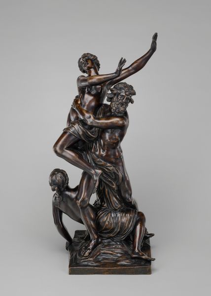 Editor: Standing here at the Met, we're looking at Giambologna's bronze sculpture, "Abduction of a Sabine," dating back to the 18th century. The composition really strikes me – this spiraling upward motion of these figures… it’s chaotic yet undeniably captivating. What do you see in terms of its structural elements? Curator: Indeed, the Mannerist style is quite apparent here. Observe how Giambologna defied the Renaissance's emphasis on stable, pyramidal forms. Instead, we encounter a figura serpentinata, a serpentine figure, where the bodies twist around a central axis. This creates a sense of dynamic movement, encouraging the viewer's eye to perpetually circle the sculpture. Note also the intricate articulation of the musculature and the polished bronze surface; light plays across it, enhancing the dynamism. How do you perceive the artist using negative space? Editor: That spiraling effect is really amplified by the way the figures interact, almost fighting for dominance in the frame. The use of negative space seems key to emphasizing their contorted forms, and giving the eye some room to grasp the sheer physicality. Does this specific compositional approach suggest anything beyond mere aesthetics? Curator: Certainly. The spiraling composition, aside from its visual dynamism, also serves a rhetorical purpose. It signifies the disruption of social order. The upward thrust of the male figure lifting the woman disrupts gravity, creating a sense of instability mirrored in the figures' emotional states. There is a semiotic relationship between the figures and the structural intent; the artist aims to visually construct tension between content and form, drawing from a complex network of visual and historical signs to generate meaning. Is the relationship between art and representation starting to emerge more clearly now? Editor: Definitely! By focusing on these intrinsic qualities, you’ve helped me to see how the sculpture’s form and materials themselves carry so much of the narrative weight. Thank you for opening my eyes to such important perspectives. Curator: It is the role of semiotics to highlight meaning generated not through representation but in structural interplay. Keep practicing seeing form first; the substance of the work will follow.