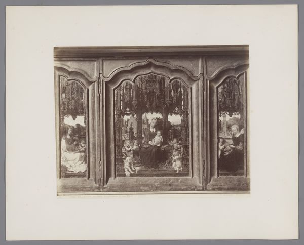 This photograph captures J.A.G. de Leur's view of stained glass windows within the Église Saint-Germain d'Argentan. Immediately, the eye is drawn to the photograph's verticality, emphasized by the architectural structure of the window. The composition is divided into three lancets, each filled with intricate scenes rendered in glass and lead. A semiotic reading reveals the cultural codes embedded in the religious iconography. We see figures and symbols traditionally associated with Christian narratives. However, the monochromatic palette, in shades of grey and brown, flattens the image, challenging the stained glass's intended luminosity and spiritual affect. The photograph's structure echoes the window's, yet it also creates a distance. The viewer is positioned outside, looking in, contemplating the representation of faith rather than experiencing its direct, colorful immersion. De Leur’s choice to photograph these windows not only preserves their image but also invites us to consider the interplay between art, architecture, and representation.