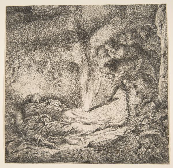 Curator: This is "Death and the Woodcutter, 4th plate" by Alphonse Legros, a work rendered with etching and ink that evokes both stark realism and deep allegorical themes. What’s your first reaction to it? Editor: Utter bleakness. Look at that woodcutter—he's petrified, clutching his meager bundle as if it’s life itself. And Death looming, almost weary, against the desolate woods. You can practically feel the chill. Curator: It’s interesting you pick up on weariness. Legros made a name for himself depicting the plight of the working class. These images often critique social structures that lead to such scenes of despair and confrontation with mortality. The print highlights the grim realities faced by many during his time. Editor: Right, so the angst isn't just in my head! The composition adds to that feeling, too. The figures are framed by these stark, almost skeletal trees. And that line work is intense, like every stroke is etching pain onto the page. The lack of color…it just amplifies the starkness. Was that a conscious decision, to omit colour in order to magnify emotion? Curator: Absolutely. The monochromatic palette directs attention to the harshness of the lines, the emotional gravity of the encounter. This also situates Legros within a tradition of printmaking used for social commentary that can be reproduced and distributed widely, adding a socio-political layer to its artistic statement. Editor: You’ve just given me a thought; what if this death figure represents systemic oppression? After all, if all these factors come together we've a poignant visual on class struggle and existential dread all in one image, then. Curator: A convincing case, definitely aligning with his concerns on inequality and the human condition. Editor: Well, whether it’s literal death or the death of hope, it's powerful stuff. Art that grabs you, you know? This piece throws a brutal mirror in our face reflecting social injustices in poignant detail. Curator: Indeed. Legros offers no easy answers, only a stark depiction, leaving us to contemplate the complex intersections of life, death, and social reality. Thank you. Editor: Pleasure's mine! Here's to art that rattles your bones, right?