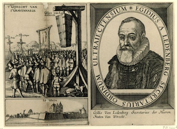 Claes Jansz. Visscher created this print, "Portrait and Execution of Gilles van Ledenberg," to depict the tragic end of a Dutch statesman. This work transports us back to a time of intense political and religious conflict in the Netherlands. Here, Visscher presents two contrasting scenes: a formal portrait of van Ledenberg and, to the left, his execution. The portrait shows van Ledenberg as a dignified man, his face etched with intelligence and experience. The execution, in contrast, reminds us of the brutal realities of political power. Van Ledenberg was a supporter of religious tolerance and states’ rights, which put him at odds with the centralizing ambitions of the Stadtholder, Prince Maurice. Consider the emotional impact of this work. It serves as both a memorial to van Ledenberg and a statement about the dangers of political and religious persecution. By juxtaposing the man with his demise, Visscher challenges viewers to consider the human cost of ideological battles. This piece doesn't just record history; it urges us to reflect on our present.