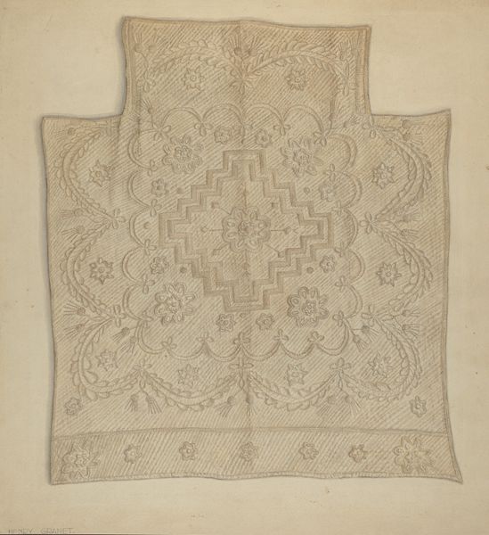 Editor: Here we have Minnetta Good's "Quilt Coverlet," created around 1938, rendered in pencil and drawing on paper. It evokes such a sense of quiet domesticity for me. The tonal range seems limited. How might you describe the composition, considering her medium choices? Curator: Formally, the artwork relies on a controlled palette, restricting itself to subtle gradations of value. Observe how the artist uses these minute tonal shifts to articulate a complex pattern. It emphasizes shape through linear configurations, dividing the picture plane. Are you noticing how each of these concentric regions, framed by ever more decoration, draw you further in? Editor: Yes, the details become denser towards the middle! It's almost dizzying the closer you look, but the consistency also adds to a sense of the artist's careful control. Curator: Precisely! The composition relies on these contrasting scales. Good employs meticulous detail but subordinates it to the grid's structure. It seems that shape and decoration dominate representational illusion. Do you agree? Editor: I think so. The subject matter is secondary to the way it's portrayed, emphasizing form over function. Even without color, there are all these fascinating variations within what at first glance appeared to be a uniform presentation. Curator: And that's the allure of formalism: appreciating art for its pure visual structure, decoding the relationship between the image and its materials. Editor: Absolutely! I learned that careful attention to these elements is critical. Curator: It allows for a deeper comprehension beyond initial thematic reactions.