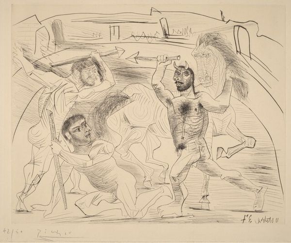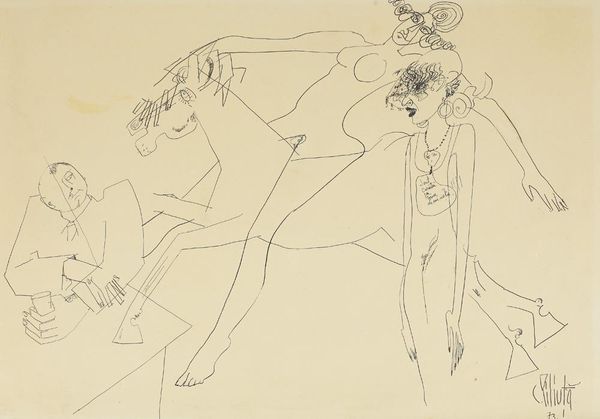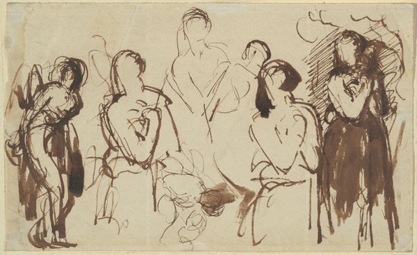 Editor: So this ink drawing, "Vier naakte vrouwen met hond en zeilboot" – "Four Nude Women with Dog and Sailboat" – by Tinus van Doorn, made sometime between 1915 and 1940, is quite striking. The figures feel both classical and incredibly raw. What's your interpretation of it? Curator: Formally, the economy of line is most compelling. The figures, the dog, even the suggestion of a landscape – all are rendered with remarkable efficiency. Observe how the varying weights of the lines delineate form and create a sense of depth, despite the overall flatness of the picture plane. What do you make of the spatial relationships here? Editor: Well, there's a dreamlike quality in the way the figures overlap and the boat floats seemingly disconnected from any horizon line. It's a very subjective space. Curator: Precisely. And note the interplay between positive and negative space. The stark white of the paper is as important as the inked lines themselves. It serves to highlight the essential forms and the deliberate ambiguity within the composition. This raises questions about the artist’s intentions. Is he exploring pure form, or hinting at a narrative beyond our immediate grasp? Consider the positioning of the figures… Editor: That's something I'm thinking about. It feels like a personal mythology or allegory. Curator: An apt observation. Van Doorn’s manipulation of line, coupled with his unconventional composition, prompts a reconsideration of representational norms. We must ask ourselves, is the drawing primarily concerned with the external world or with something more fundamentally internal to the artist? Editor: I see what you mean. Focusing on the composition opens up more questions than answers, and maybe that's the point! Curator: Indeed!