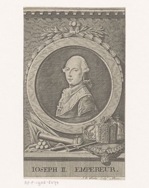 Curator: We’re now looking at a work by Johann Ernst Mansfeld, "Portret van Giovanni Battista de Gaspari." This print, an engraving, likely dates between 1749 and 1796. Editor: My first impression is of contained formality. The oval portrait, framed by leaves, creates a structured yet somewhat constricting space for the subject. Curator: Indeed. The rigorous linear technique enhances this sense of order. Note the detail in the lines creating subtle shading. This isn't just about capturing likeness, but also conveying status through the precision of form. We observe here the line as pure form; its capability of capturing light, and therefore shaping depth. Editor: And the framing itself contributes to this. Laurel wreaths, classically symbols of honor and victory. They emphasize the intellectual pursuits associated with Gaspari. The inscription below confirms that: "Historian". One might wonder what narratives he chronicled, what he championed. It appears there’s a coat of arms visible there, too, denoting nobility or accomplishment. Curator: Good point. This adds another layer of meaning. Formally, its placement provides a grounding weight to the composition. Its presence gives historical and social depth to the image’s overall structure. Semiotically it works as a sort of echo to the framing above, while balancing out the written information contained below. Editor: It's interesting how these visual elements, like the oval and the coat of arms, keep bringing us back to notions of boundary and belonging in Gaspari's era. Who was in, and who was out? What symbols legitimized their place in society? Even the drape behind the figure appears staged, a deliberate effort in artifice that speaks to broader socio-political dynamics. Curator: Absolutely. This image can be perceived as both document and artistic intervention. It reflects and reinforces specific ideologies through deliberate construction of visual forms. Editor: Seeing these combined visual elements enmeshed, you realize the visual narrative goes far beyond likeness. Curator: I find this an extremely perceptive observation, thank you. Editor: Thank you. It’s all about considering all the available, in addition to inherent artistic and cultural signals.
