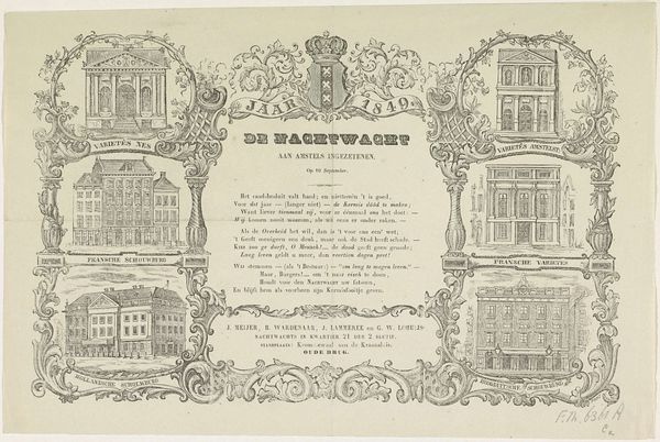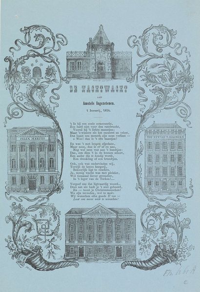 Editor: We're looking at "Nieuwjaarswens van de Amsterdamse straatveegsters, 1857," a print – both etching and engraving, I think – created around 1856 or 1857. The Rijksmuseum attributes it to an anonymous artist. It has a fascinating, almost promotional feel. What historical context helps us understand it? Curator: Indeed. It’s crucial to see this through the lens of 19th-century urban development and social reform. Consider the rising importance of sanitation in rapidly growing cities like Amsterdam. The print celebrates the street sweepers but also reinforces ideas about social order. How do you think it does that? Editor: Well, the detailed depiction of street sweepers suggests respect for their labor, but the ornamental frame and poetic text also elevate the everyday into something almost ceremonial, a duty or civic ritual. Curator: Precisely. Think about who this “Nieuwjaarswens” was aimed at. "Opgedragen aan de ingezetenen der Stad Amsterdam." "Dedicated to the citizens of the City of Amsterdam." This wasn't just a simple New Year's card. It’s a visual and textual argument for maintaining social harmony through recognizing—and, perhaps, subtly controlling—labor. What's the impact of linking this labor to the New Year? Editor: That makes sense! Presenting this hard work as part of a hopeful new beginning subtly encourages the public to cooperate and contribute to the city’s cleanliness and, therefore, its well-being. Curator: Exactly. The seemingly simple image of street sweepers becomes a complex negotiation of social roles, expectations, and the emerging ideals of a modern, ordered city. It uses genre-painting tropes in a promotional setting. A fascinating confluence. Editor: I didn't expect this print to be so multifaceted. It’s fascinating how an image designed to simply send New Year wishes can also teach us about the era’s views on social hierarchy and the dignity of work. Curator: Absolutely! It underscores the value of looking beyond the surface to unpack the complex cultural meanings embedded within even the most unassuming artworks.