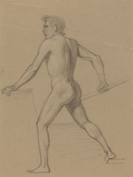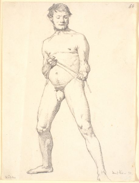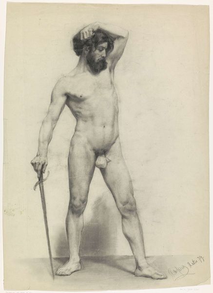 Pieter de Josselin de Jong created this monochromatic drawing of a nude man with a sword using graphite on paper. The drawing exhibits a compelling interplay of light and shadow, accentuating the sinuous contours of the body. The composition is structured around a central vertical axis established by the figure and the sword. The smooth gradations of tone suggest a classical influence, reminiscent of academic figure studies. Yet the gaze directed downwards and the seemingly melancholic pose introduces a psychological element, a departure from mere anatomical rendering. The sword—an obvious signifier of power and virility—leans passively, it's point resting on a simple cube. This juxtaposition creates a tension between the conventional symbolism of weaponry and the vulnerable, introspective stance of the figure. Ultimately, this study invites us to reflect on the semiotics of masculinity and its representation within the artistic tradition. The drawing destabilizes established meanings, engaging with new ways of thinking about representation.