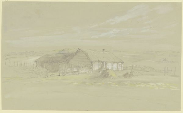 Curator: Here we have a sketchbook page by Jan Hoynck van Papendrecht, titled "Boerderij bij Laren en de achterzijde van een hooiwagen," dating from 1888. It features both a watercolor study of a farm and a delicate pencil drawing of a hay wagon. Editor: Immediately, I’m struck by the contrast between the two halves. The farm, rendered in soft watercolor, feels substantial and lived-in, while the hay wagon, sketched in pencil, seems almost ghostly, like a fleeting memory. Curator: The contrast speaks to the rapid changes occurring in rural life during this period. Van Papendrecht captures both the enduring presence of agricultural structures and the increasing mechanization of farming. We're seeing a society grappling with its past and its future. Editor: Absolutely. And the choice of media amplifies that. Watercolor, with its fluidity and tendency to bleed, lends itself to capturing the atmospheric qualities of the landscape, whereas the precise, almost technical quality of the pencil drawing highlights the intricacies of the hay wagon. Curator: There's also something to be said about the act of sketching outdoors, "en plein air," as they would. Artists at the time began depicting everyday life more often, turning their back on more traditionally grand themes and engaging more intimately with society's workforce. Editor: That intimacy feels crucial, doesn't it? By placing the farm and the wagon side-by-side, the artist forces us to confront the labor embedded within these seemingly idyllic rural scenes. We see not just beauty, but also the tools and infrastructure that sustain it, and perhaps an implied commentary about wealth and exploitation. Curator: These sketchbook leaves also speak to the educational methods used by the artist. It highlights their attempts to capture both their physical surroundings, like a farmstead, but also their study of technical machinery in pencil, likely to study their dimensions. Editor: It’s interesting to see how a seemingly simple sketchbook page can open up a wider conversation about labor, technology, and the evolving relationship between humanity and the land, especially as it relates to the rise of industrial labor. Curator: Indeed, the image is a great point of contemplation in trying to see the past and the way people viewed and expressed it, while at the same time providing useful insight for current social matters. Editor: I'm left with a renewed appreciation for how art helps us excavate the layered narratives of our collective past.