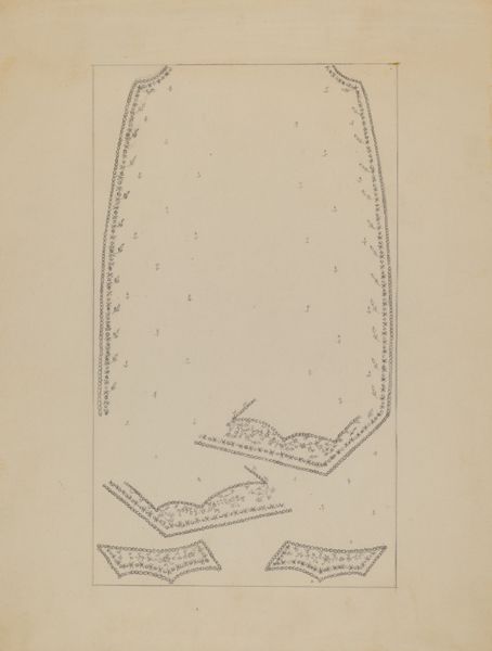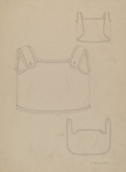 Curator: Standing here, I’m drawn to the ethereal lightness of this pencil drawing. It feels almost like a whispered memory. Editor: It's “Night Cap” by Percival Jenner, made between 1935 and 1942. A very specific type of garment immortalized simply using pencil on paper. It evokes such domestic intimacy but I wonder, intimacy for whom? Curator: Intimacy, that’s it! Like uncovering an old photo. I imagine it feels very personal for Jenner, capturing such intricate details of, what appears to be, hand-sewn trim. A simple, loving record of something precious, even ephemeral. Editor: Right, but "ephemeral" is deceptive. Nightcaps, like other forms of domestic textiles, index labor—particularly that of women. The seemingly delicate lines belie the socio-economic realities ingrained within that handmade lace. How does its careful rendering flatten this tension? Curator: I can also see it as celebrating the dedication and skill inherent in the making. To lovingly draw something so detailed requires, I would argue, a similar form of attention as was poured into the stitching itself. It’s art mirroring craft, don’t you think? Editor: I do. And the very muted color palette only heightens that sense of something half-recalled, hinting perhaps at nostalgia but also, simultaneously, the very tangible constraints of gendered labor in that era. Its a very deliberate rendering, very deliberate index of a specific temporality. Curator: Absolutely, the limitations become a part of the poetry. But to zoom back a bit… doesn’t the meticulousness with which Jenner captures every tiny detail amplify its beauty in some way? Transform it? Editor: To transform labor into an art object does not erase the history embedded in that object but makes it even more complex. Something so private, so bound to domestic space is here elevated to public attention… Curator: Yes, elevated! It's lovely to ponder what these very lines hide or reveal. Thanks. Editor: Likewise. What do these shadows protect, and who is allowed to see it? These are questions I can’t seem to leave behind.