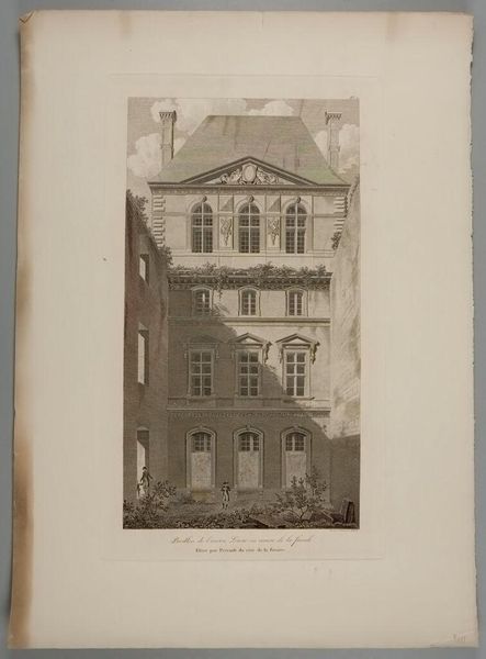 Curator: Oh, there’s something so still and proper about this one, isn't there? Editor: Indeed. This print, held here at the Rijksmuseum, presents a "View of a Villa on Rauchstrasse 19 in Berlin, Germany." Dating from before 1877, it's rendered with incredible precision, a style leaning toward realism. The building's described as neoclassical, from what I gather. Curator: Well, "stark" might be another word for it. All straight lines and cobbled stone… I imagine someone very serious lived there. A banker, perhaps, with a penchant for perfectly symmetrical flower beds. Editor: Look at how the geometric forms interplay, though. The rectangular windows offset by that rounded arch above, that delightful frieze. The engraver paid meticulous attention to texture—observe the differences between the brick, the stone, and the leaves of the trees on the side. This artwork illustrates a mastery of line and form! Curator: Right, I get that—it’s technically impressive, for sure. I suppose the realism tries to let the villa speak for itself. It just lacks... soul? Makes me think about how private lives remain obscured despite these depictions of domestic grandeur. Editor: Privacy is a poignant concept. It’s important to consider the purpose. The cityscapes became a source of cultural identity at the time; how we now define nationhood became codified. Consider this: even an anonymous artist engraves a vision of space. Curator: Absolutely. Makes you wonder, doesn't it? Who walked those streets? What stories did that house hold? Sometimes the things that are left unsaid whisper the loudest. Editor: Precisely. Through its restrained formality, the engraving opens space for considerations, about form, urban growth, representation, identity—perhaps that’s the source of its soul.