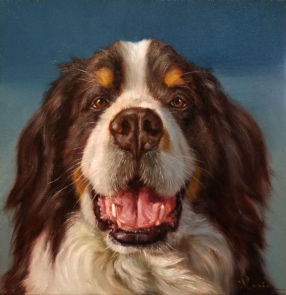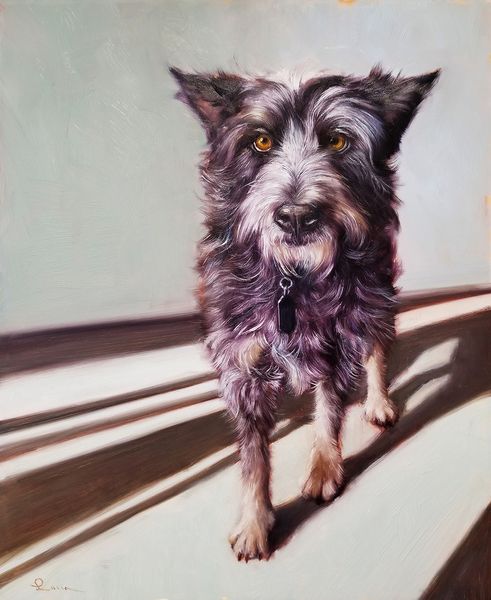 Lucia Heffernan painted "Sadie" using oil on canvas, a traditional medium employed to capture the essence of her canine subject. Heffernan's choice to paint animals, particularly in human-like poses or attire, invites us to reflect on our relationships with them, and how we project human qualities onto the non-human world. Her work taps into our cultural fascination with pets, and the emotional bonds we form with them. Sadie, with her earnest gaze and delicate collar, embodies both vulnerability and dignity. Heffernan captures the way pets are integrated into domestic life and often become integral members of the family. "Sadie" speaks to how pets offer companionship and emotional support, and serve as mirrors reflecting our own emotional landscapes. The painting invites a contemplation of our shared vulnerabilities and the quiet joys of companionship, prompting a dialogue about empathy, connection, and the stories we weave into our lives through our bonds with animals.