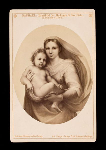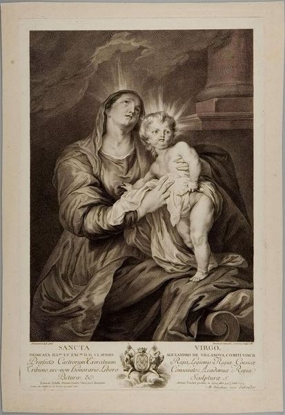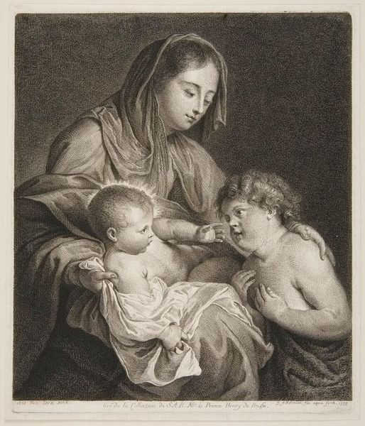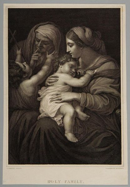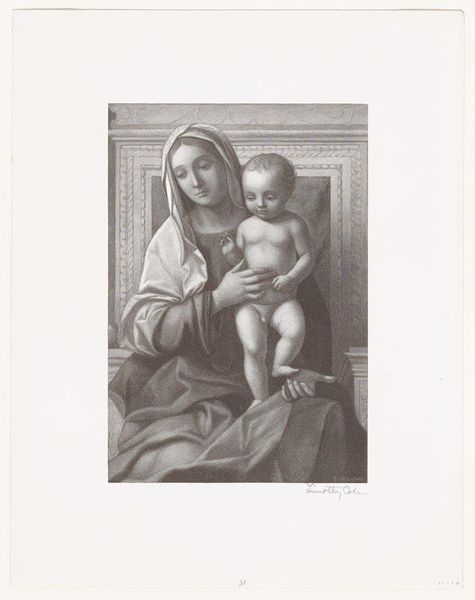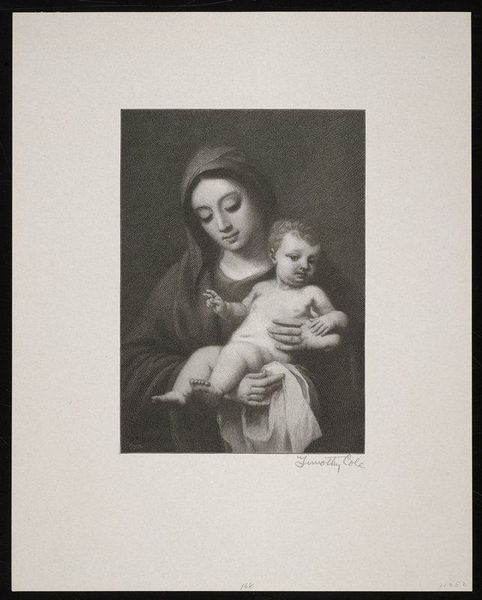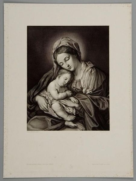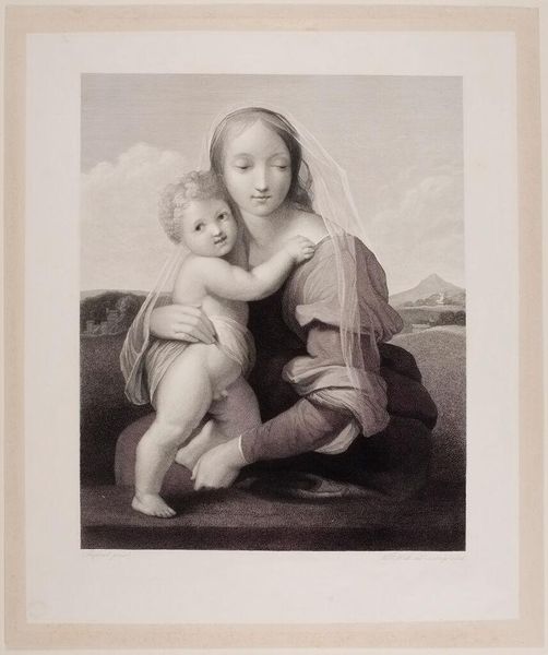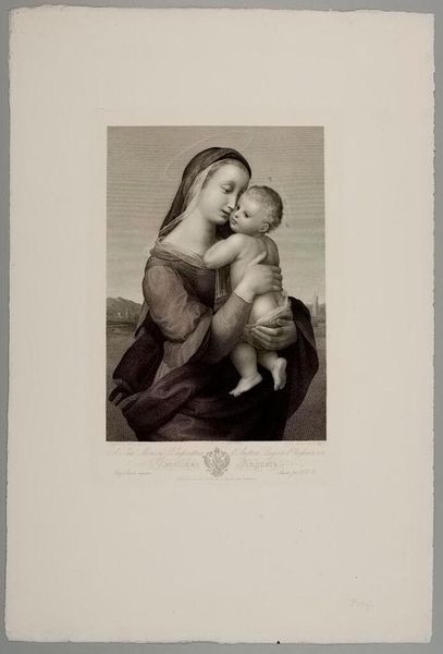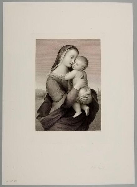 Curator: Antonio Morghen, born in 1788, created this piece, "Madonna of Casa Tempi." It's currently housed here at the Harvard Art Museums. Editor: It has such a tender feel, doesn't it? The way they’re almost nose to nose. Curator: Absolutely. Morghen's process involved meticulous engraving, capturing the softness and intimacy of the mother and child. Consider the economy of line, the value placed on subtle gradations of tone. It was surely a laborious process, requiring a mastery of material. Editor: It's a scene everyone can relate to. The way the mother is holding her child. And the background kind of melts into the main figures, it all serves the main focus: the closeness between them. Curator: It is precisely this focus, this deliberate production, that renders it significant, moving beyond mere religious iconography into an intimate portrayal of human connection. Editor: Yes, a testament to connection that resonates across time. I'll definitely be thinking about this one for a while.