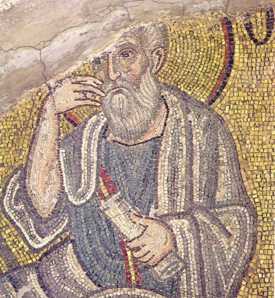 Curator: Here we see a section of Byzantine mosaics called Saint Peter, part of the Eucharist Cycle in Saint Sophia Cathedral in Kyiv, Ukraine, dating from 1113. What do you make of it? Editor: The first thing that strikes me is the somber expression, the face carved out of light and shadow in such a way it reminds you of a weathered landscape and the hands almost grasping…as if reaching out through centuries. Curator: Yes, that intense gaze. If we examine the materiality, the individual tesserae are small and irregular, which gives that glittering effect but also speaks to the labour involved, not just by the named artists but the many anonymous hands involved in quarrying and preparing materials, each piece contributing to the overall image. Editor: Right, think about the placement! Each tiny tile is almost like a pixel now; but placed with a delicate artistic, as well as devotional consideration. Do you think of that flicker between earthly toil and the otherworldly gleam of gold... a sort of visual hymn? Curator: Precisely, and this shimmer amplifies the hieratic style. If we look at his robes we notice, again, these tiny pieces used for texture in these flowing lines, not so much realistic as symbolic. And look at his offering, which is taking something from an unrevealed holy figure; that's something interesting when we think of it in context. Editor: Definitely interesting! A subtle moment. How was it viewed then versus how we see it now as an artefact in this historic and geographically important Cathedral. Curator: This highlights shifts in Byzantine religious understanding over time. Today it functions largely as heritage but let's not forget this artistry served clear liturgical functions for the Byzantine Empire. The placement was very important. Editor: Makes you imagine the cathedral in full worship...a sensory explosion with chants reverberating off those meticulously placed tiny colored stones! We're merely glimpsing a fragment; yet through your material perspective I imagine, somehow, hearing those echoes. Curator: Absolutely. Its artistic survival after nine centuries brings all those layered histories of material, spiritual intent, and meaning, forward for contemporary viewing. Editor: Indeed. Layers, all waiting to be reflected upon.
