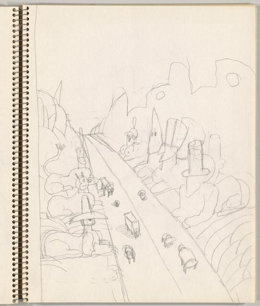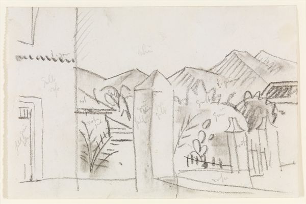 Editor: Here we have Willem Witsen's "Heuvellandschap met bebouwing", or "Hilly Landscape with Buildings," made with pencil around 1914-1916. It's a delicate line drawing. The composition feels like a quick study, a fleeting impression captured on paper. What do you see in the relationships between the different formal elements at play? Curator: The immediate impression is one of dynamic spatial construction. Note how the artist employs the graphic element of line to delineate forms, creating depth and recession into the landscape. Consider, too, the interplay between the clustered buildings and the undulation of the hills, juxtaposed against the organic brushwork of the suggestive tree. Does this create tension, and if so how? Editor: It does create a kind of push and pull between the more rigidly defined architectural structures and the looser forms of the natural world. The lightness of the pencil adds to that contrast, doesn't it? How else does the medium of drawing affect the composition? Curator: The inherent quality of line in drawing allows for an emphasis on contour and shape, fostering a strong sense of visual rhythm. Furthermore, observe the texture. It's clear how pencil as medium offers a delicacy. Editor: Yes, that subtlety really draws you in. I can see how paying attention to line, form, and medium really changes how I read this artwork! Thanks. Curator: Precisely. Focusing on these components unlocks meaning from visual analysis, refining our art appreciation.