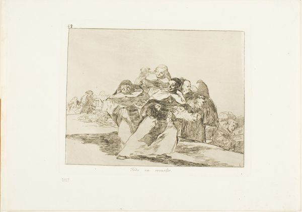 Editor: This is "Woman Resting with her Daughter in a Landscape," a print by Joseph Meganck, dating from 1817 to 1891. The mood is quite somber. What stands out to me is the simple bond between the mother and child, rendered in such intricate detail. What do you see in this piece? Curator: The image resonates with familiar, almost archetypal themes: the mother as a protector, the landscape as a symbol of life’s journey. Notice how the mother gazes into the distance, perhaps contemplating the future, while the child seems more connected to her mother. Meganck, through the landscape and the attire of the figures, links the earthly and spiritual worlds, creating an allegory of sorts. The mountains represent enduring strength and aspiration, providing a contrasting backdrop for the tenderness of the domestic scene. Are the mountains more than just mountains in this image? Editor: Yes, now that you mention it, the mountains give a sense of timelessness. The whole scene has a mythic, universal quality, rather than depicting one specific mother and child. Curator: Precisely. Also consider how the printmaking technique itself, with its delicate lines and contrasts, creates a sense of both vulnerability and resilience. It is in the darkest lines, and their relationships, where meaning and strength are formed, just like in life. Meganck may well have chosen printmaking to underscore this connection between the enduring images of motherhood and their constant retelling through cultural memory. The emotional core lies within those tiny choices. Editor: It’s amazing how much depth is captured in what initially seems like a simple portrait. Looking closely, I see this complex interplay of symbols and meanings now. Curator: Visual culture allows us to contemplate connections through shared human experience, connecting the terrestrial with the divine through shared cultural stories that endure over time.