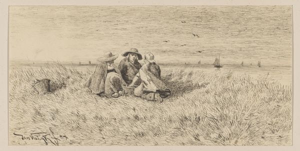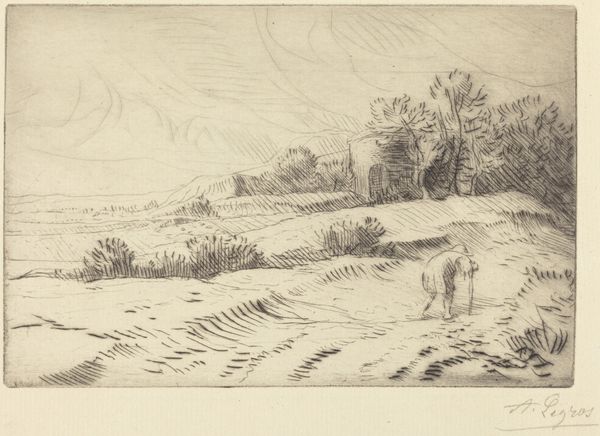 Charles-François Daubigny created this etching, "Path Through the Wheatfield," in 19th-century France. Daubigny was a significant figure in the Barbizon School, a group of artists who rejected the formal constraints of the Academy and sought to depict nature in its raw, unidealized form. In this print, we see figures seemingly at rest amidst a bountiful wheatfield. The scene reflects a broader cultural shift towards valuing rural life and labor, particularly as industrialization transformed French society. It challenges the academic tradition that favored historical or mythological subjects. The loose, sketch-like quality of the etching, achieved through Daubigny's innovative use of the medium, mirrors the Realist movement's emphasis on direct observation and honest portrayal. To understand Daubigny's contribution, studying Salon exhibition records, artist biographies, and period journals can offer a more complete picture of the artistic debates of his time.