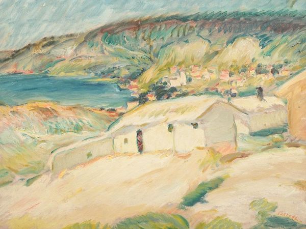 Magnus Enckell created this landscape from the Naples region using oil paints. He has used the medium to capture the tranquil essence of the shoreline. The visible brushstrokes across the canvas demonstrate the artist's intimate engagement with the material, creating a sense of texture and depth. Enckell would have applied the paint in layers, building up the composition through careful manipulation of color and tone. This technique is aligned with the tradition of plein air painting, which saw artists venture out of the studio to capture the immediate sensory experience of a location. But it also involved a fair amount of labor, requiring patience to build up layers of detail and capture the subtle nuances of light and shadow. Paying close attention to materials and processes gives us a richer appreciation of the labor and choices embedded in every artwork, challenging any divide between fine art and craft.