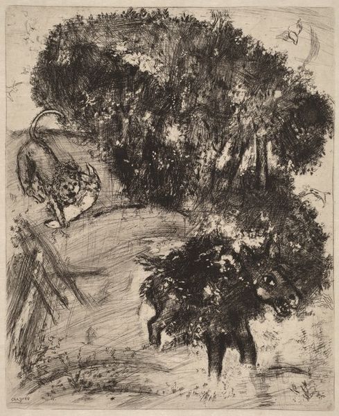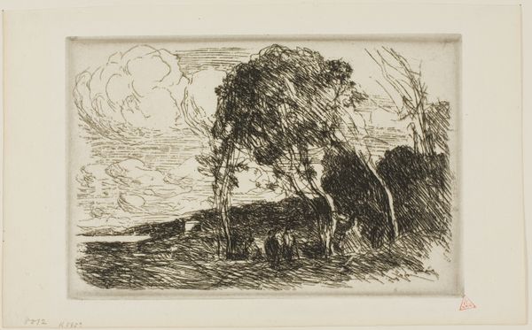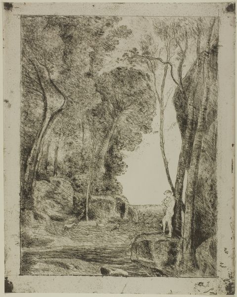 This is Camille Corot’s “The Gallic Round,” an etching, printed in black ink on paper. At first glance, the composition presents a dense thicket of lines forming trees and foliage. Corot’s mark-making creates a texture almost like a woven fabric, where individual strokes blend into a unified surface. The varying densities of these lines define shapes and suggest depth. The left side of the image is more open, allowing the eye to wander into a lighter, almost airy background. Corot’s approach reflects a shift from precise realism towards capturing the sensation of light and atmosphere. The use of etching technique serves this aim, allowing for a multitude of fine lines that evoke a sense of natural vitality. There is an emphasis on subjective experience over objective representation. Notice how the absence of rigid forms encourages multiple interpretations. The work resides in the space between representation and abstraction. Corot invites us to reflect on the very act of seeing and how we construct meaning from visual cues.
