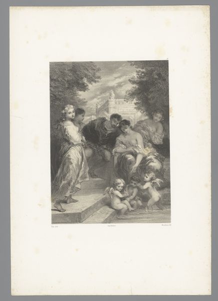 Editor: This is "Bloemenmarkt," an etching by Albert Glibert from 1873. It depicts a busy flower market. I’m immediately struck by the detail – you can almost feel the bustle of the crowd. What underlying themes do you observe? Curator: The flowers themselves speak volumes. Notice how they are presented not just as objects of beauty but as items of commerce, changing hands, creating relationships, a subtle reflection of social exchange. Look closely at who is buying and selling. What do their clothes tell us about their status? Consider the unspoken language between the classes during that era. Editor: It does feel very performative, almost like everyone is putting on a show. Is this a common element in art from that period? Curator: Absolutely. It echoes the genre painting prevalent during the period, with the detailed dress codes of each rank. There is always a moral lesson and story underlying genre paintings. Have you ever considered the cultural symbolism inherent in flower markets themselves? Historically, they can be places of courtship, transaction, clandestine exchanges, all carefully coded within visual languages. Do you perceive any of that complexity here? Editor: I can definitely see those tensions, especially between the different social classes depicted. Now that you point it out, there’s almost a feeling of suppressed emotion amidst all the vibrant detail. Curator: Exactly. What looks initially like a snapshot of everyday life becomes a richer text to interpret, layered with symbolic meanings and historical context, once we start asking deeper questions about visual imagery. Editor: It's amazing how much I missed at first glance. I now notice things I would have otherwise not even considered!