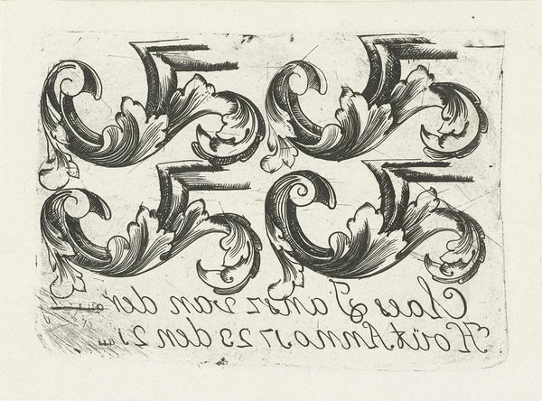 Curator: Look at this intriguing piece, "Langwerpige cartouche met rolwerk," dating back to 1579. It's an engraving by an anonymous artist, showcasing the decorative arts prominent during the Renaissance. The details are amazing. Editor: It immediately strikes me as restrained, almost austere, despite its decorative nature. The precise lines and limited shading evoke a sense of formality and perhaps the restrictions placed on art during that period? Curator: Indeed, the formality is significant. The cartouche itself, designed as a frame for text, holds a vital symbolic role. It announces and contains knowledge. In many cultures, the act of framing, of bordering, gives emphasis and imbues meaning. Editor: I am thinking of that emphasis and questioning whose knowledge and meaning is being privileged here. Consider the cultural context; Europe was experiencing widespread religious and political upheaval. Could this ornate frame, this carefully controlled design, represent an attempt to impose order amidst that chaos? Curator: That is a really valid point, and one could also say, perhaps this careful attention to the detail also speaks of the emergence of humanism, and the belief in humanity's creative potential. Look at the geometric shapes—circles, curves—carefully balanced, and that recurring motif right in the middle – doesn't it suggest harmony, control over the natural world through intellect? Editor: Yes, but I can't divorce myself from the larger political picture. Northern Renaissance art frequently carries coded symbolism reflective of its socio-political climate, whether intentional or not. The very act of ornate design, particularly for the elite, also sets it apart from more vernacular, democratic forms of expression. I wonder who exactly the original audience was and who was excluded. Curator: Those considerations push the boundaries of the work further and are always important when discussing visual art. Considering how images can speak to multiple levels of cultural expression can open doors to understand history in much more intimate and nuanced ways. Editor: Agreed. Examining historical objects through an intersectional lens lets us question not just what we see, but who gets to see and interpret it, as we add another layer to our own cultural memory.