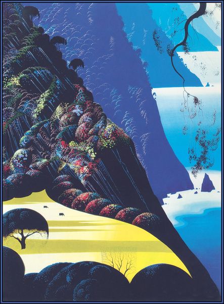 Curator: Here we have Eyvind Earle's "Yellow Leaves," painted in 1988 using acrylics in a plein-air style. It's such a visually striking landscape. What are your first thoughts? Editor: It feels almost… staged. The way the colors pop and the stark silhouettes create this sense of dreamy unreality. Like a childhood memory of a landscape. Curator: That's fascinating. Earle often focused on capturing form through his use of color and the simplification of shapes. Look at how the sky blends subtly behind those rolling hills. They seem to echo each other, right? And the stylized trees? There's almost a dream-like abstraction going on here. Editor: Absolutely. And those yellow leaves—the sudden splash of warmth against all those cool blues is really the anchor. Gold often stands for transformation and something that is impermanent and fleeting. They symbolize so much change against an enduring blue landscape, and really do something evocative. Curator: Symbolism seems so prominent here! Like those darker silhouettes—it's interesting how they almost dominate, creating a sense of both mystery and familiarity at the same time. Like the cycle of life through shifting perspectives. The landscape as seen but maybe unseen? Editor: Exactly! There is a strong connection to both the real world but also something just outside of comprehension in our cultural memories. This image echoes folk art but adds Earle's refined geometry—suggesting he has something to say with the image but leaves a bit up to each one of us to decode. Curator: It's as if he distilled nature to its purest essence—lines, shapes, colors and emotions, maybe? Editor: I think that's fair. I really didn’t expect to see that kind of complexity or potential depth, but now that you point it out… It adds another dimension. Curator: It's definitely worth considering how those naive art aspects blend and what cultural ties can be explored within. Editor: True—definitely a painting that grows on you. The layers of symbolism create an immersive experience.
